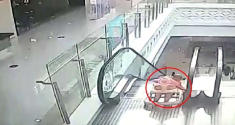 Çin'de bir alışveriş merkezinde annesinin bir kafede sohbete dalması üzerine başıboş kalan yürüteçteki bebek, yürüyen merdivene doğru ilerledi. Kimsenin fark etmediği bebek, yürüyen merdivenden yuvarlandı.