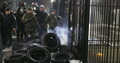 Başkent Kiev'deki Rusya Büyükelçiliğine duman fişekli saldırılar düzenlendi. Elçilik binasının önüne atılan lastikler bir süre sonra ateşe verildi.