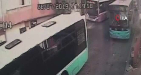 Güvenlik kameralarına yansıyan görüntülerde, halk otobüsü bir anda kontrolden çıkıyor. Duvara çarpan otobüs kaldırıma çıktıktan sonra iş yerinin kapısına çarpıyor. O esnada otobüsün önünde olan bir başka otobüs şoförü ise aracın altında kalmaktan kıl payı kurtuluyor. Otobüsün şoförü ve diğer şoför şoke olurken, çevredeki vatandaşlar da koşarak otobüsün yanına geliyor.