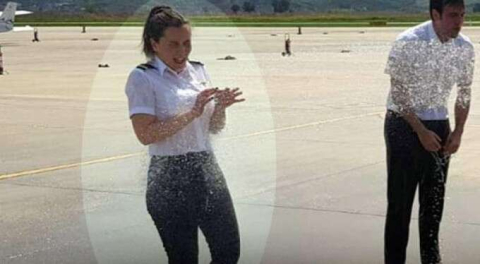 Arkadaşları tarafından sosyal medyada paylaşılan görüntülerde Merve Altun'un havacılıkta ilk yalnız uçuş sonrası yapılan ıslatılma kutlamasına katılması ve şınav çekmesi yer alıyor.