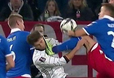 Liechtenstein forması giyen sol bek Jens Hofer'in maçın henüz 9. dakikasında Leon Goretzka'ya yaptığı faul gecenin ve maçın sonucunun önüne geçti. RAKİBİNİN BOĞAZINA TEKME ATTI