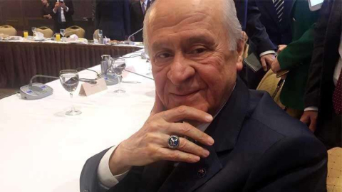 MHP Genel Başkanı Devlet Bahçeli, gazete, televizyon ve ajansların Ankara temsilcileri ile sabah kahvaltısında bir araya geldi. Bahçeli, son bölümü sohbet havasında geçen toplantıda parmağındaki yüzüğü anlatarak, "Mavi taş, özel yapım klasik yüzük. Kırmızı bölümde Türkistan haritası, yanlarında ise kurt ve üç hilal var" dedi.