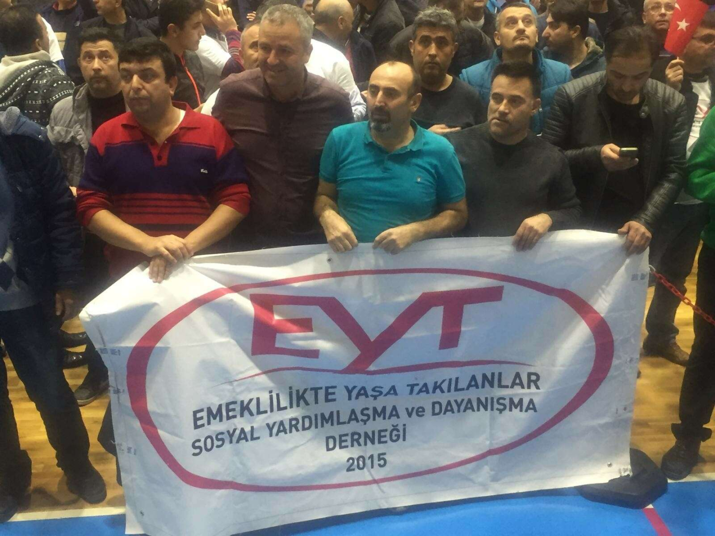 Bursa’da ikinci kez buluşan Emeklilikte Yaşa Takılanlar Sosyal Dayanışma ve Dayanışma Derneği (EYT) üyeleri, kapalı spor salonunu tıklım tıklım doldurarak izdiham oluşturdu.