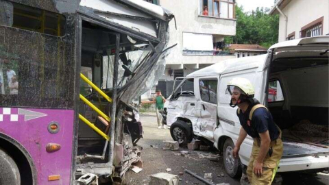 Sürüklenen otobüs minibüsü duvara sıkıştırırken kazada ilk belirlemelere göre 4 kişi yaralandı.