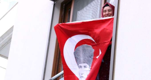 Kulaksız, evine gelenleri Türk bayrağı ile karşılarken, bina girişine de Türk bayrağı astı.