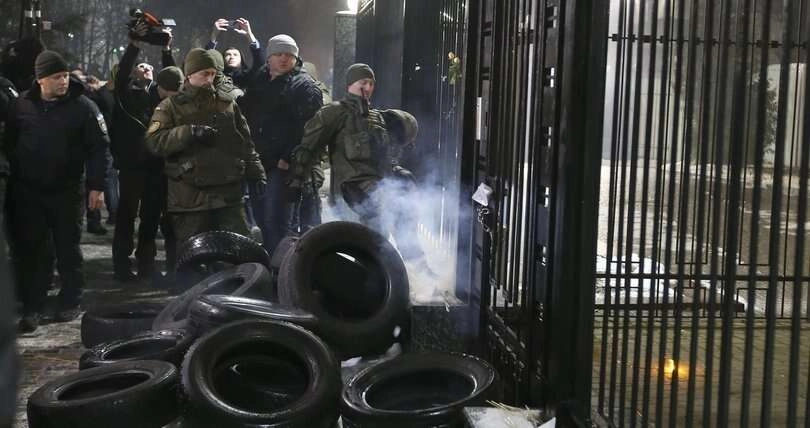 ELÇİLİK ÖNÜNDE PROTESTO Öte yandan, Ukrayna’nın başkenti Kiev’de Rusya Büyükelçiliği önünde lastik yakılarak ve elçilik binası önüne gemi maketleri konularak protesto gösterileri düzenlendi. Başkent Kiev'deki Rusya Büyükelçiliğine duman fişekli saldırılar düzenlendi. Elçilik binasının önüne atılan lastikler bir süre sonra ateşe verildi. Ukrayna medyasına yansıyan haberlerde, Rus Büyükelçilik binasına duman fişekleri ve bombasıyla saldırıda bulunulduğu belirtildi. Kiev Emniyet Müdürü Andriy Kriçenko'nun olay yerine gittiği, güvenlik güçlerinin bölgede güvenliği sağlamaya çalıştığı kaydedildi. "Rusya'ya ölüm" sloganları atıldı. Ukrayna'nın başkenti Kiev'de Rusya Büyükelçiliği önünde toplanan yüzlerce kişi Moskova'yı protesto etti. Göstericilerden bazıları molotof kokteyli atarken, büyükelçiliğe ait bir araç ateşe verildi.