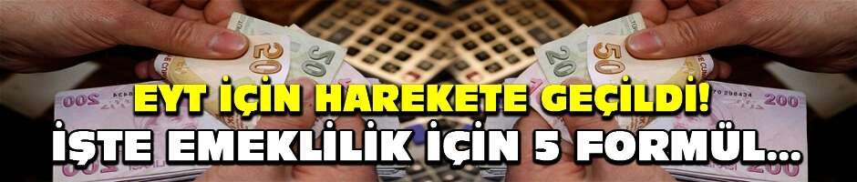 Emeklilikte Yaşa Takılanlar’a (EYT) ilişkin federasyon ve platform temsilcilerinden oluşan bir heyetin geçen çarşamba günü TBMM’de AK Parti Grup Başkanvekili Muhammet Emin Akbaşoğlu ve MHP Grup Başkan Vekili Erkan Akçay ile görüşmesi, EYT müjdesi bekleyenleri heyecanlandırdı. Emeklilikte yaşı bekleyenler 8 Eylül 1999 öncesi sigortalı olan ve hali hazırda emekli olamayanlardan oluşuyor. Temaslarda EYT’lilerin, sorunun bu yıl içinde çözüleceği yönünde mesajlar aldığı belirtilirken, Türkiye gazetesinin haberine göre; EYT’liler için daha önce şu formüllerin gündemde olduğu belirtilmişti: