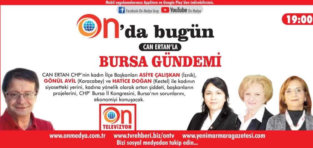 CAN ERTAN CHP'NİN kadın İlçe Başkanları Asiye ÇALIŞKAN(İznik), Gönül AVİL(Karacabey) ve Hatice DOĞAN(Kestel) ile kadının siyasetteki yerini, kadına yönelik olarak artan şiddeti, başkanların projelerini, CHP Bursa İl Kongresini, Bursa'nın sorunlarını ekonomiyi konuşacak.