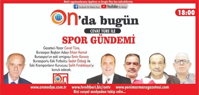 Gazeteci- Yazar Cevat Türe, Bursaspor Başkan Adayı Erkan Kamat, Bursaspor'un eski amigosu Emin Karaca, Bursasporlu eski futbolcu Sedat Özbay ile Eski kramponların kurucusu Salih Fındıkkaya'yı konuk edecek.