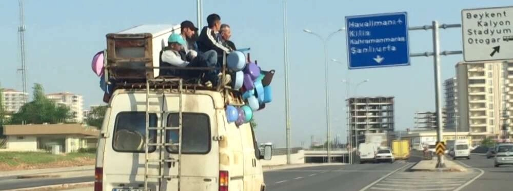 Gaziantep’te içerisinde ve üst kısmında tamamen eşya ile doldurulan bir transit tipi aracın üzerinde yolculuk yapan 4 kişinin tehlikeli yolculuğu görenleri korkuttu. Çevredeki sürücü ve vatandaşları ilk gördüğünde gülümseten görüntülerde, aracın tepesinde eşyalarla birlikte yolculuk eden 4 kişi yürekleri ağza getirdi. Tüm uyarı ve tehlikeye rağmen yolculuklarını sürdüren 4 kişi etrafındaki meraklı ve korkulu gözlere aldırış etmeden hallerinden memnun bir şekilde yollarına devam etti. Eşyalara rağmen minibüsün tepesinde yolculuk eden şahısları görenler ise "En havadar yolculuk", "gökyüzü seyahat" gibi esprili yorumlar yaptı.