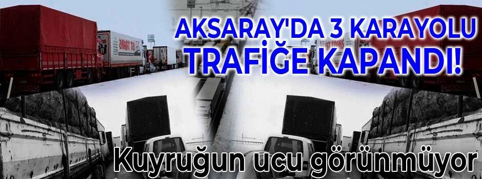 Aksaray’da dün sabah saatlerinde başlayan Kar yağışı ve tipi halen etkisini sürdürüyor. Tipi sebebiyle dün gece Konya yolu trafiğe kapatılırken halen etkili olan kar yağışı ve tipi nedeniyle Aksaray-Adana ve Nevşehir yolları da trafiğe kapatıldı. Karayollarında oluşan uzun kuyruklar dron ile görüntülendi. Polis ve jandarma ekipleri karayollarında geniş güvenlik önlemleri alırken hiçbir aracın geçişine izin verilmedi. TIR'lar ve otomobillerin birçoğu karayolunda kalırken, diğerleri de dinlenme tesislerine çekildi. Yolda kalan ve tesislere çekilen araçlara kumanya dağıtımı yapıldı. Tesislerde kalan şehirlerarası yolculuk yapan otobüslerde bulunan yolcular da polis ekipleri tarafından bölgedeki yurtlara yönlendirildi.