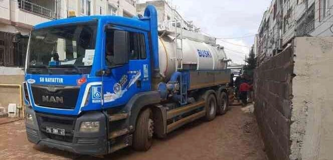 Asrın felaketinde deprem bölgelerinde canla başla çalışan Bursa Büyükşehir Belediyesi BUSKİ Genel Müdürlüğü ekipleri, selin vurduğu Şanlıurfa'da da yaraları sarmak için yoğun bir mesai harcıyor.