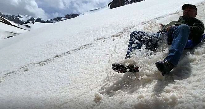 Erzincan'dan 3300 rakımlı Munzur Dağlarının karlı zirvelerine yürüyerek çıkan bir grup doğasever vatandaş, Mayıs ayında kışı yaşadı. Hava sıcaklığının sıfır dereceyi bulduğu zirvede erimeyen karlı alanda poşetle kızak keyfi yaşayan vatandaşlar, doyasıya eğlendi.