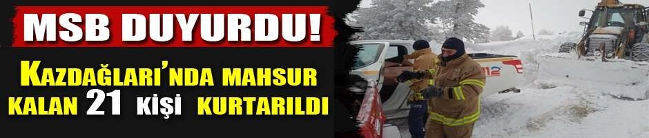 Milli Savunma Bakanlığının Twitter hesabından yapılan açıklamada, “Kazdağları’ndaki (Balıkesir) yoğun kar yağışı nedeniyle bölgede mahsur kalan personelimiz ve belediyenin yol açma ekipleri kurtarıldı. Balıkesir Valiliğimize ve belediye çalışanlarımıza desteklerinden dolayı teşekkür ediyoruz” ifadelerine yer verildi.