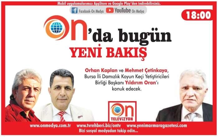 ON TV'Yİ İZLEMEK İÇİN : 1- https://facebook.com/onmedyagrup 2- http://onmedya.com.tr 3- http://tvrehberi.biz/ontv 4- http://yenimarmaragazetesi.com 5- Play Store'dan On Televizyonu mobil uygulamasını indirerek On TV Haber başta olmak üzere ülkemizin önde gelen TV kanallarını takip edebilirsiniz.