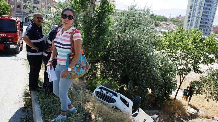Niğde'de, kontrolden çıkan otomobil, takla atarak şarampole yuvarlandı. Mahalle muhtarı sürücü Tuğba Somkaya, araçtan burnu bile kanamadan çıktı.