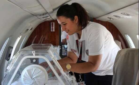 Ambulans uçakta hastaların havada yaşayabileceği tüm olumsuzluklara hazırlıklı olduklarını dile getiren Acil Tıp Teknisyeni Zeynep Coşkun, “hastalarımızın yüzde 60'a yakını yenidoğan vakalar, bunları Doğu bölgelerinden alıp Batı bölgelerine getiriyoruz. Yüzde 40'ı da yetişkin vak`alar.