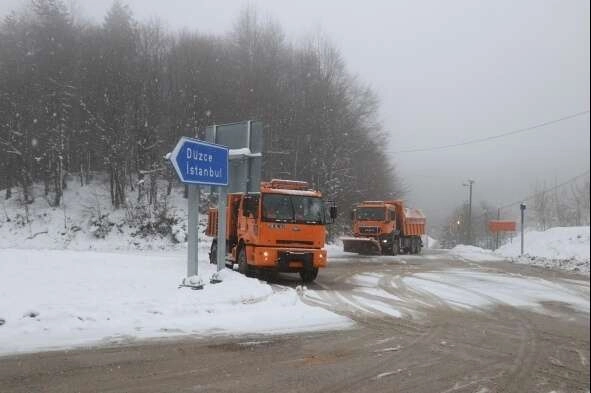 Düzce'de öğle saatlerinde başlayan kar yağışı, D-100 karayolu Bolu Dağı kesiminde etkisini sürdürüyor.