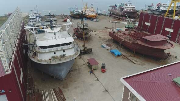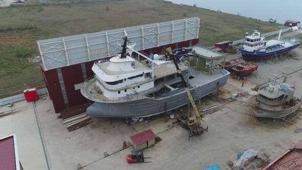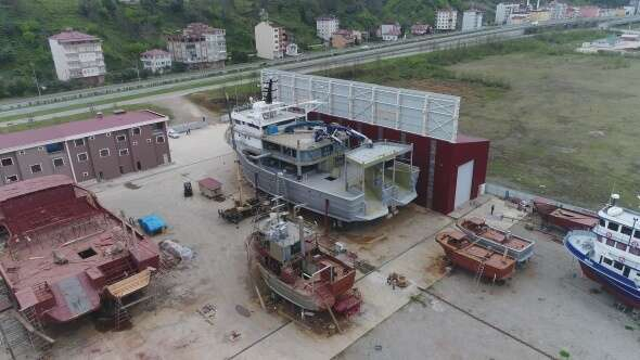 Trabzon'un Sürmene ilçesindeki tersanede yapımı süren Türkiye'nin en yüksek ve en geniş balıkçı teknesi suya ineceği günü bekliyor.