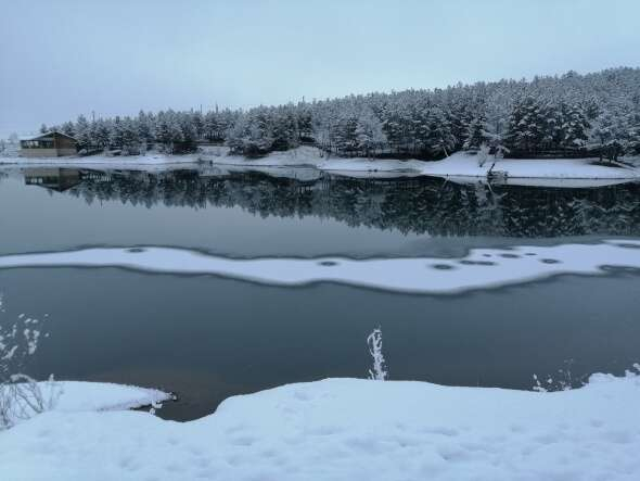 Yozgat Çamlığı Milli Parkında bulunan Cevdet Dündar göleti çevresinde bulunan asırlık çam ağaçlarının karla kaplanması kartpostallık görüntüler oluşturdu.
