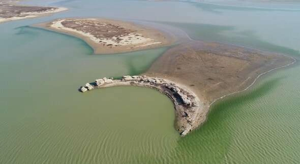 Adana'da kuraklık nedeniyle Seyhan Baraj Gölü`nde su seviyesi düşünce tarihi Milattan Önce`ye dayanan ve yıllardır sular altında olan Augusta Antik Kenti`nin bir bölümü gün yüzüne çıktı.