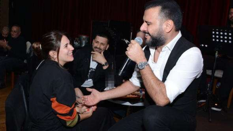 Eşinin gözlerinin içine bakarak aşk şarkıları söyleyen Alişan, bir ara Buse Varol'un masasının önüne gelip diz çöktü. Eşine Selami Şahin'den 'Tapılacak Kadınsın' parçasını okudu.